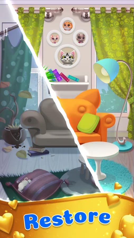 in a distant forest in the meadow there was an abandoned and destroyed house. Cute cats found it and decided to turn it into their sweet home. Let's help charming cats to restore the beauty of the house and equip it!