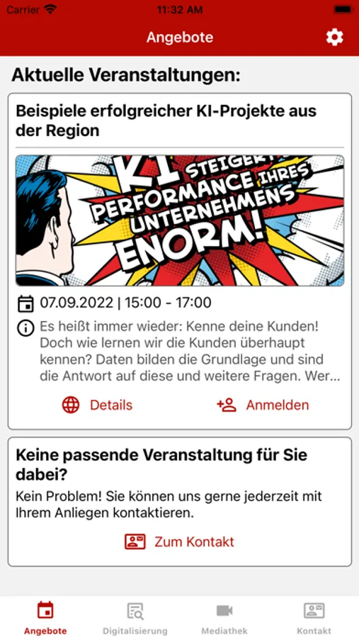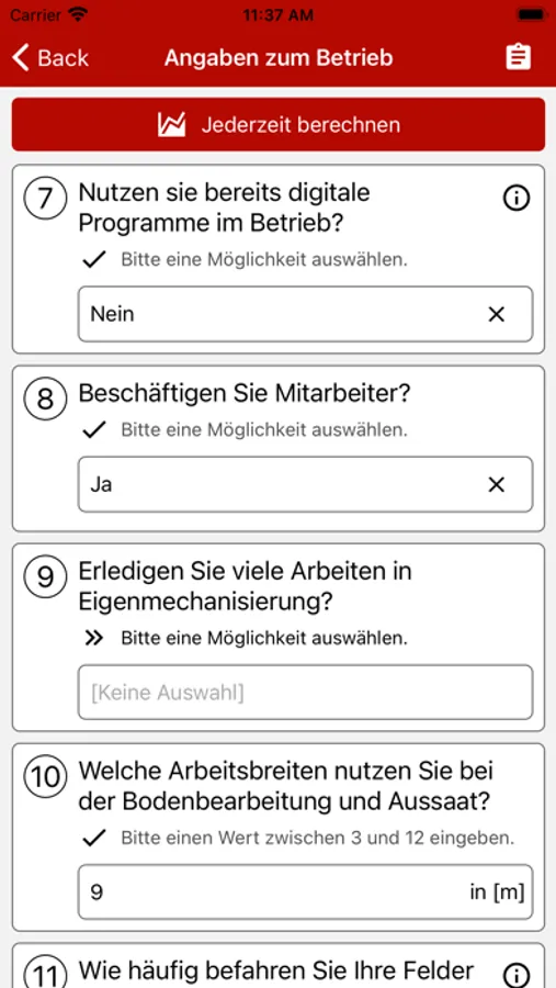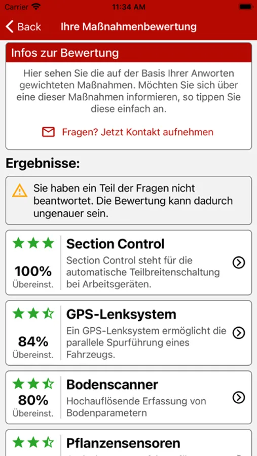 Nach Beantwortung einiger Fragen können Sie das Digitalisierungspotenzial in Ihrem eigenen Betrieb bewerten lassen. Anhand von Videos, Veranstaltungshinweisen und Erklärmaterial können Sie sich weiterführend über die Digitalsierungsmaßnahmen direkt in der App informieren. Sämtliche von Ihnen angegebenen Daten werden anonym behandelt und nicht gespeichert.