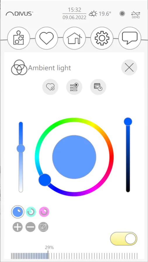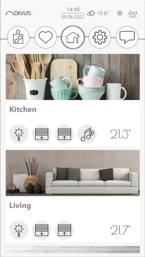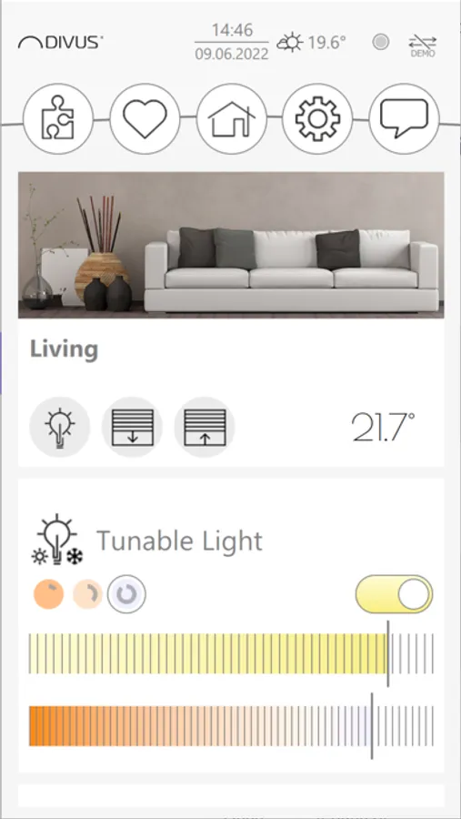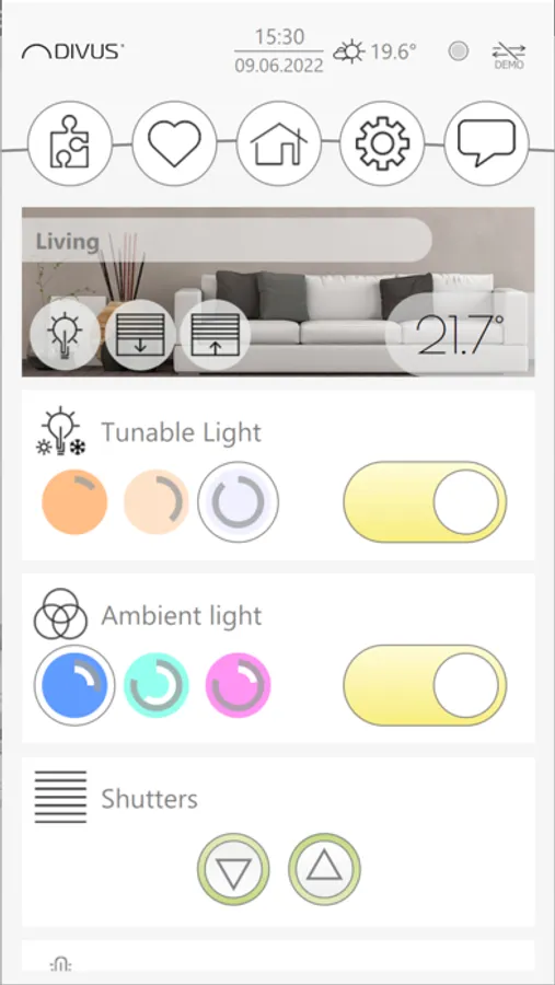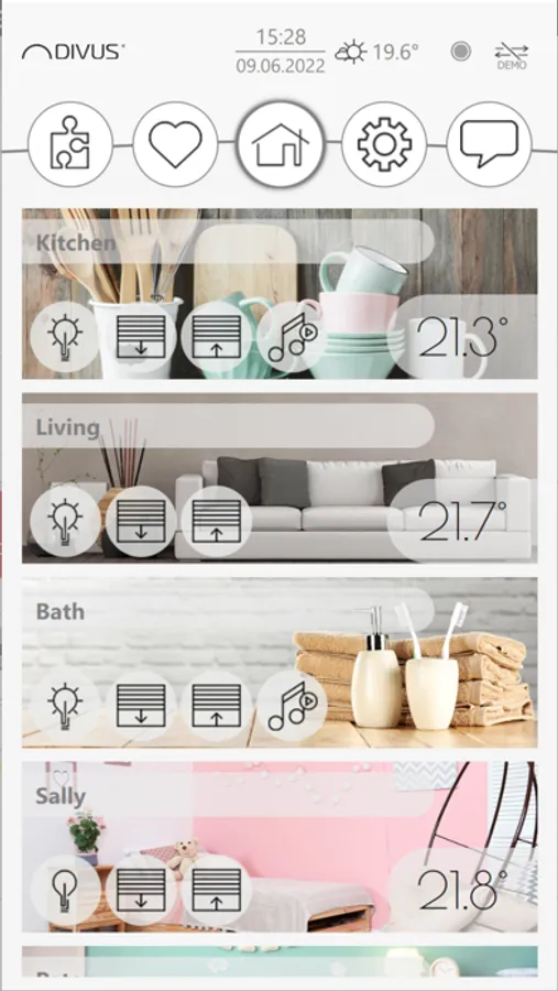 The visualization user interface DIVUS VISION convinces with its simplicity in the implementation by the system integrator and control by the customer. Lights, shading, temperature, music, alarms can be controlled and controlled via the panel. In addition, smart devices can be integrated into the visualization.