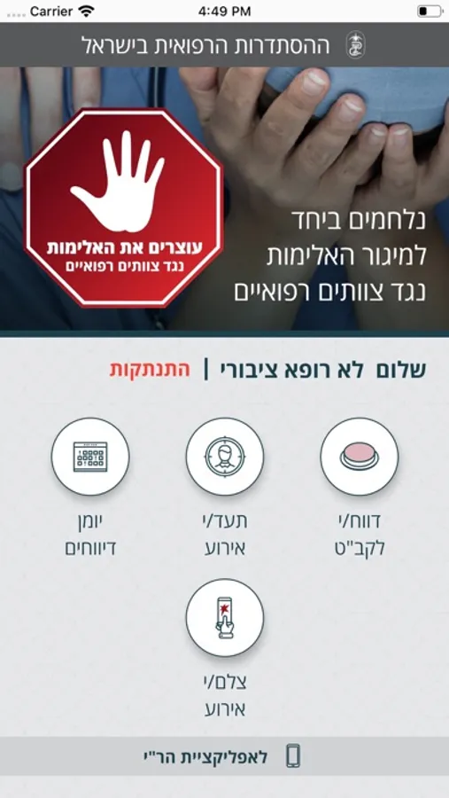 עלה רעיון להציג אמצעי עזר נוסף, טכנולוגי, בפיתוח אפליקציה ייעודית. מטרת האפליקציה לסייע בזמן אמת של אירוע אלימות כנגד רופאים, וגם בסופו של דבר, להיות כלי מסייע להפחתת מקרי האלימות נגד רופאים ונגד הצוות הרפואי.