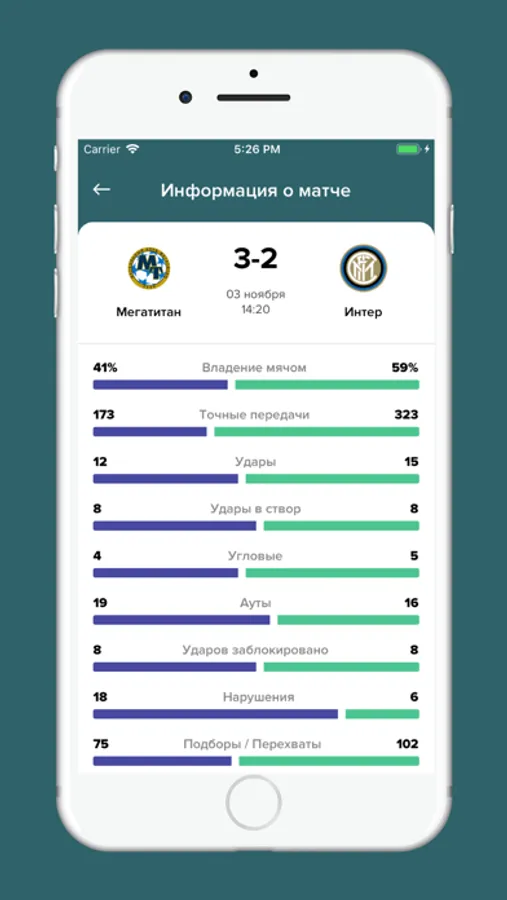 - Просмотр статистики по прошедшим матчам;