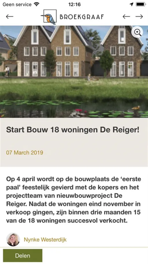 Met Broekgraaf krijgt Leerdam een nieuwe, ruime, kinderrijke, bloeiende wijk. Direct gelegen aan de natuur van het Groene Hart, dus volop de gelegenheid op avontuur te gaan, te ontdekken. Hier kan je je eigen droomhuis bouwen en plezier maken. Mét het comfort van de voorzieningen in onze Glasstad op een steenworp afstand. Iedere nieuwe bewoner wordt vriendelijk welkom geheten en voelt zich direct thuis. Hier zorgen we voor elkaar, ontmoeten elkaar om te ontspannen, organiseren samen met de buren leuke evenementen of genieten van het groen en het water om ons heen. Buiten leven is daarmee toegankelijk voor iedereen. Broekgraaf weerspiegelt je woondroom! Speciaal voor haar bewoners is deze app ontwikkeld.