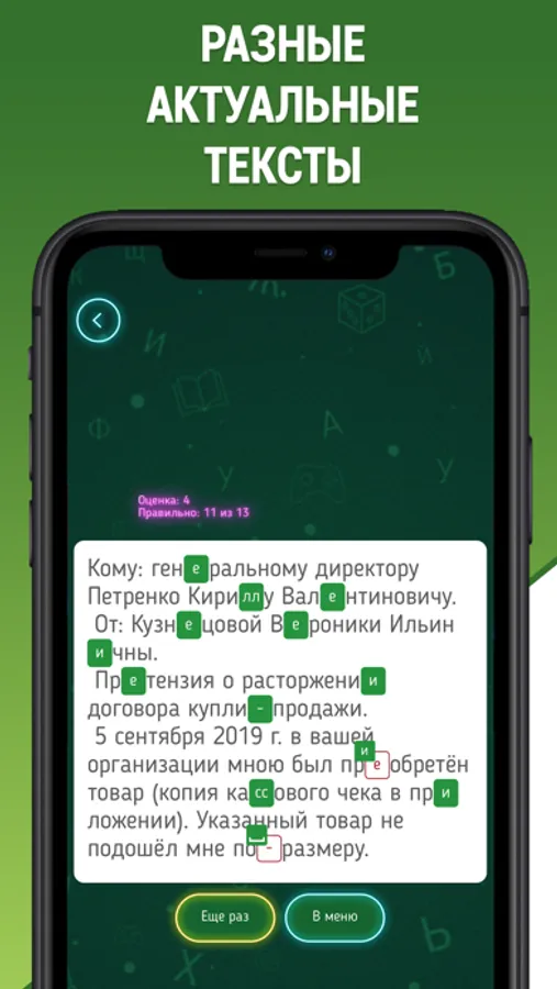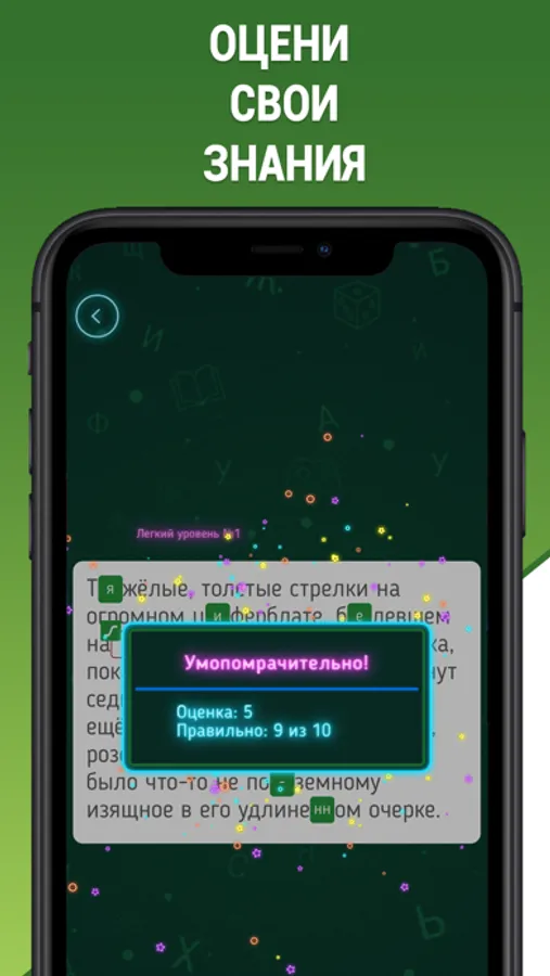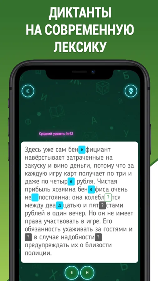 Завершив диктант, пользователь узнает статистику и уровень своей грамотности, а также сможет посоревноваться с другими игроками онлайн.