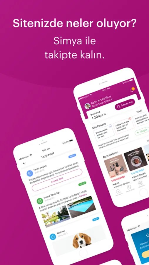Simya mobil uygulaması sayesinde aidat ödemelerinden tesis yönetimi hizmetlerine, fırsatlardan duyuru ve etkinliklere aradığınız her şey parmaklarınızın ucunda!