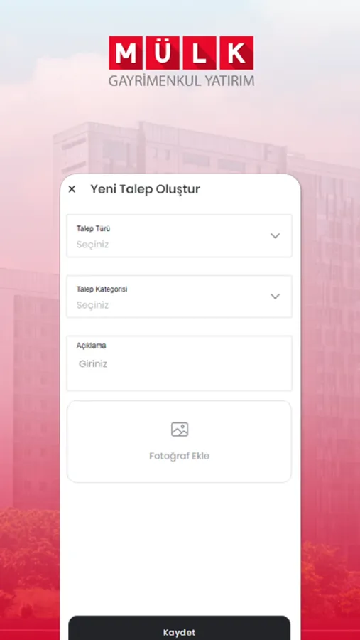 • Taleplerim; Teknik, Güvenlik, Temizlik, Bahçe Bakım vb. hizmetlerinde tespit edilen olumsuz durumların fotoğrafını çekerek iş talebi oluşturma,