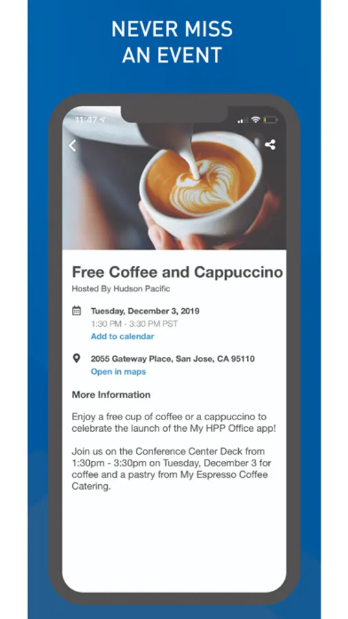 Life doesn’t stop when you get to the office. My HPP Office keeps you up-to-date on your office building’s news, events and more. Sign up for a wellness class, learn about building amenities and services, and receive timely building alerts. Developed by Hudson Pacific Properties for its tenants and their employees, My HPP Office is designed to seamlessly connect you with your place of work