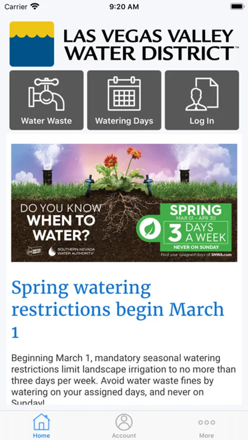 The Las Vegas Valley Water District app allows customers to view and pay their bills, see water usage history, find their assigned watering days and report water waste, all while on the go. Customers also may opt in to receive important bill and conservation-related notifications.