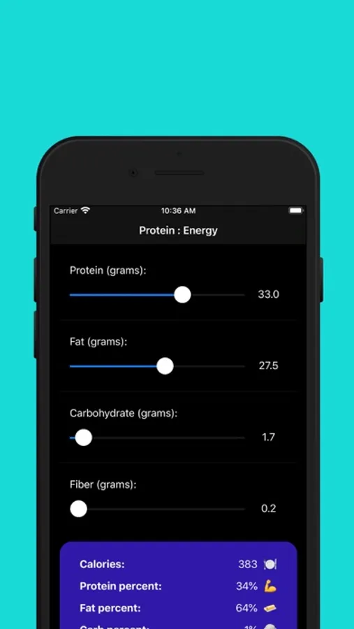 Enter you macronutrients using the sliders or text fields and see the results displayed below.