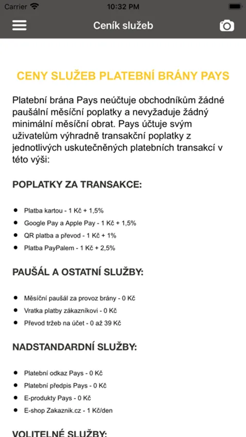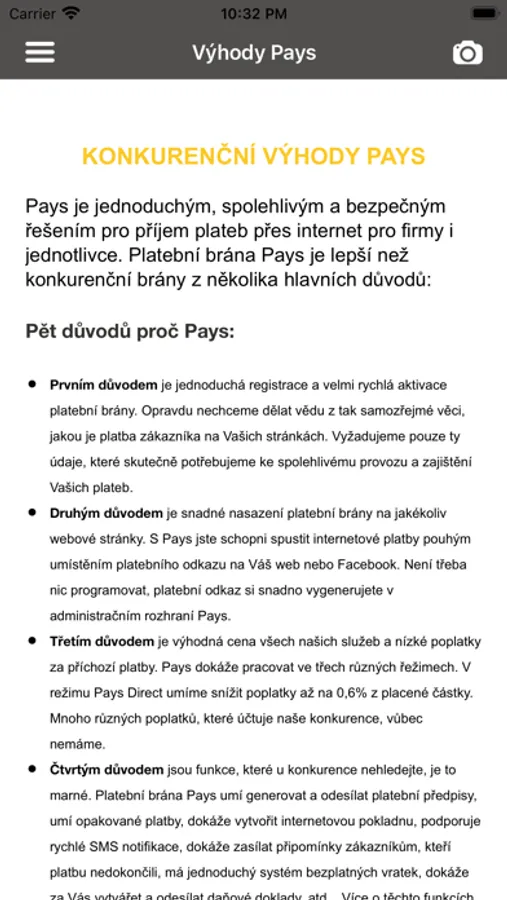 Aplikace Pays usnadňuje správu a ovládání platební brány obchodníkům. Prostřednictvím aplikace se můžete přihlásit do své administrace, kontrolovat příchozí platby, provádět vratky, zasílat potvrzení zákazníkům. Lze také přímo stahovat měsíční výpisy, zadávat platební předpisy a platební odkazy. Velmi jednoduše můžete provést okamžitý převod tržeb na svůj bankovní účet.