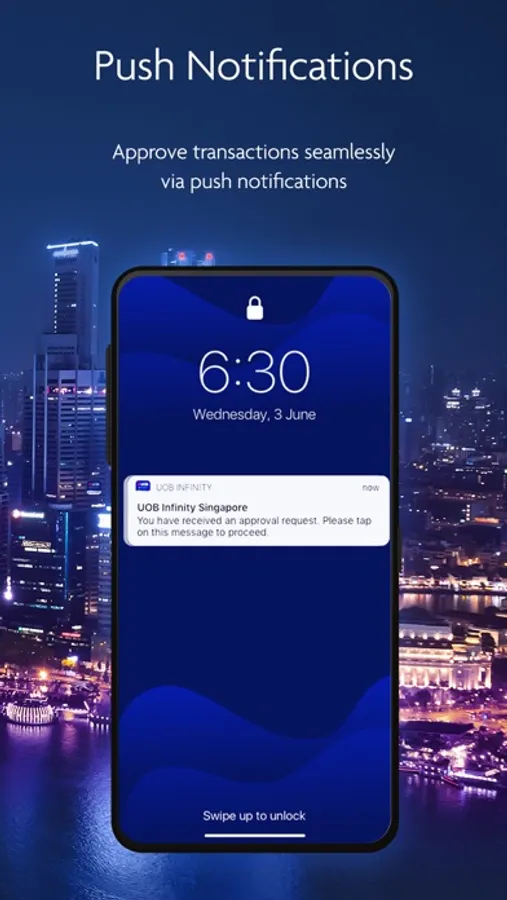 • Push Notification - Provide authorisation via push notifications received on the UOB Infinity mobile app.