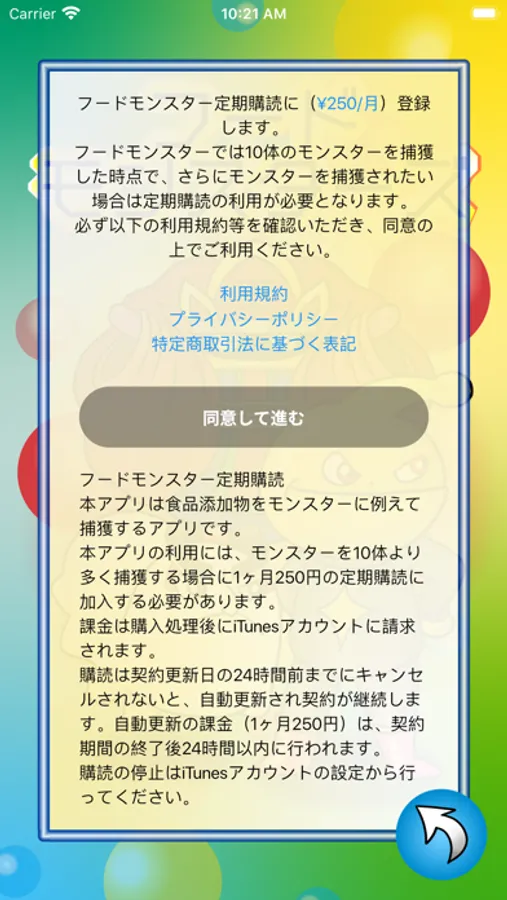 本アプリの利用には、モンスターを10体より多く捕獲する場合に1ヶ月250円の定期購読に加入する必要があります。