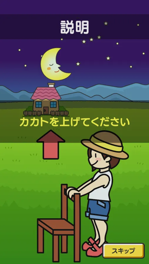 次にゲーム説明が始まります。この段階で踵(かかと)の上げ下げを行うと、画面内のキャラクターの動きも同様に変化します。画面の指示に従って進めてください。椅子や壁などに手を置き、不安定にならないように注意しながら行ってください。このゲーム説明はスキップすることができます。