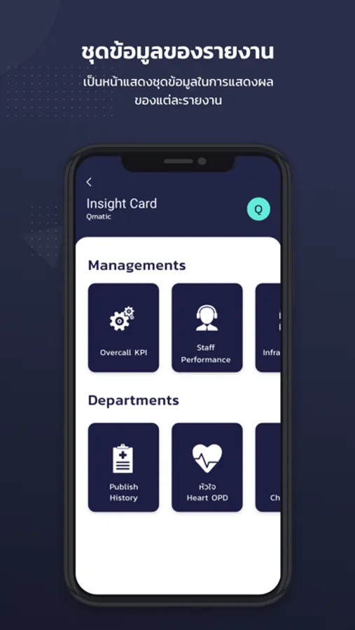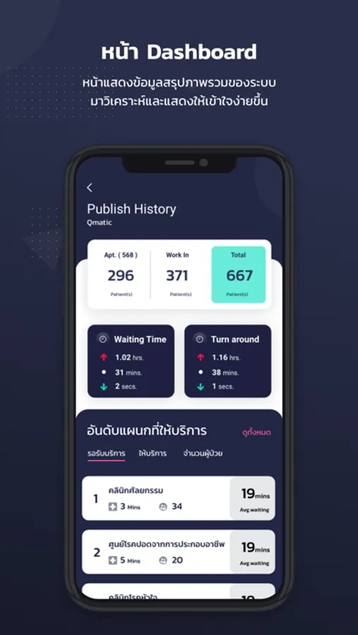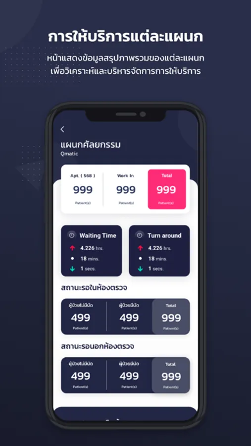 แอปพลิเคชันสำหรับการดูข้อมูลสรุปการให้บริการผู้ป่วยของแต่ละโรงพยาบาล จะมีการแยกสิทธิ์การเข้าถึงข้อมูลรายงานแต่ละหน้าจอโดยแยกตามตำแหน่งของผู้ใช้งาน ตัวอย่างข้อมูลสรุปรายวันที่แสดงผล ได้แก่ ข้อมูลจำนวนผู้ป่วยที่เข้ารับบริการทั้งหมด ข้อมูลระยะเวลาการรอรับบริการ ข้อมูลระยะเวลาการเข้ารับบริการ และข้อมูลอันดับแผนกที่ให้บริการ เป็นต้น