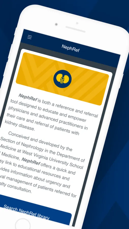 Conceived and developed by the Section of Nephrology in the Department of Medicine at West Virginia University School of Medicine, NephRef offers a quick and easy link to educational resources and provides information about urgency and interval management of patients referred for specialty consultation.