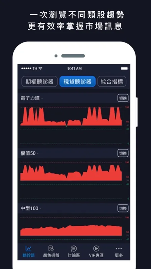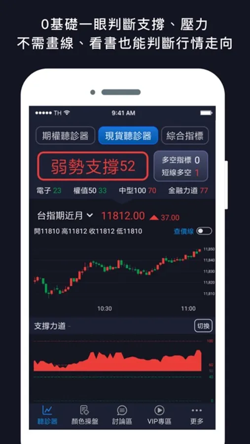 多空聽診器app利用多種指標、顏色、圖像化呈現,讓你快速判斷多空,新手不用任何基礎,只要看得懂數字和圖片,就能快速找出進出場點,不錯過任何進場機會。