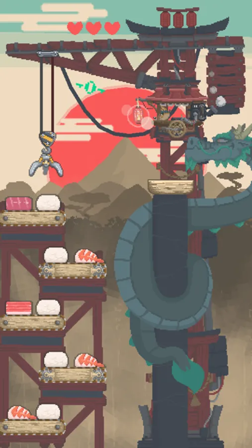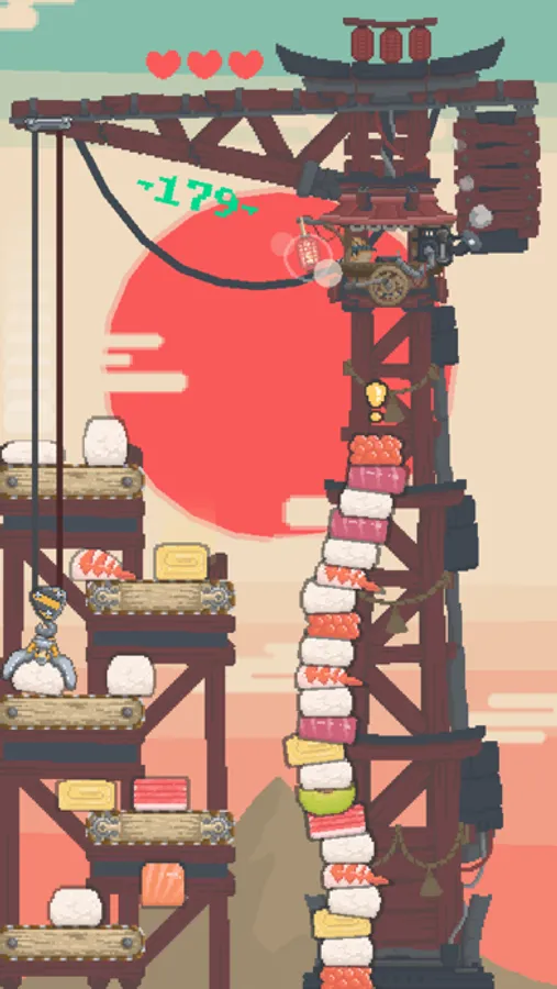 Rising Sushi is a fast paced arcade with easy and intuitive one touch controls where your skill to grab and drop giant pieces of sushi with a claw in the right moment and order is key to assemble an endless tower and score points.