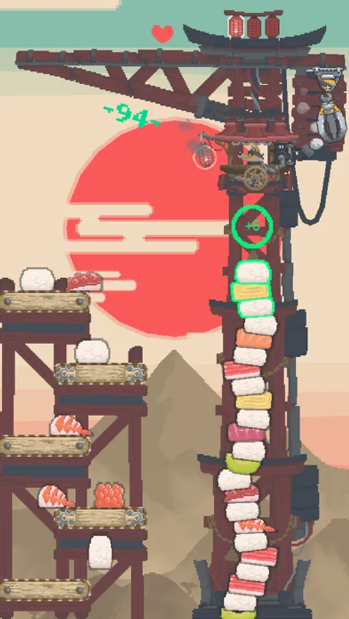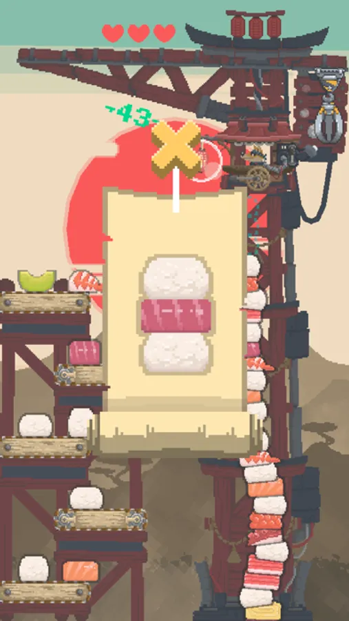 Stack sushi perfectly, don’t miss any placement and when you get a streak of three perfect pieces, you'll activate the fever mode, changing the claw for a sushi cannon with which pieces fall non-stop at a frantic rate in a shooter mini game.