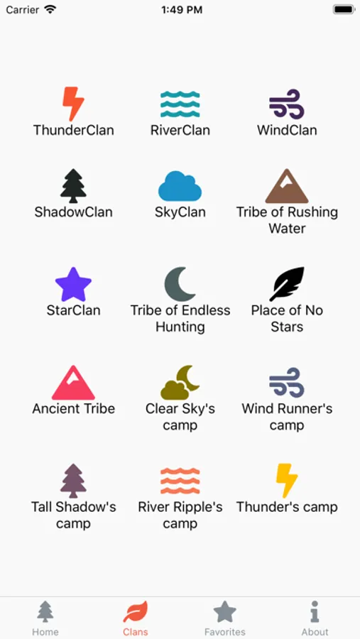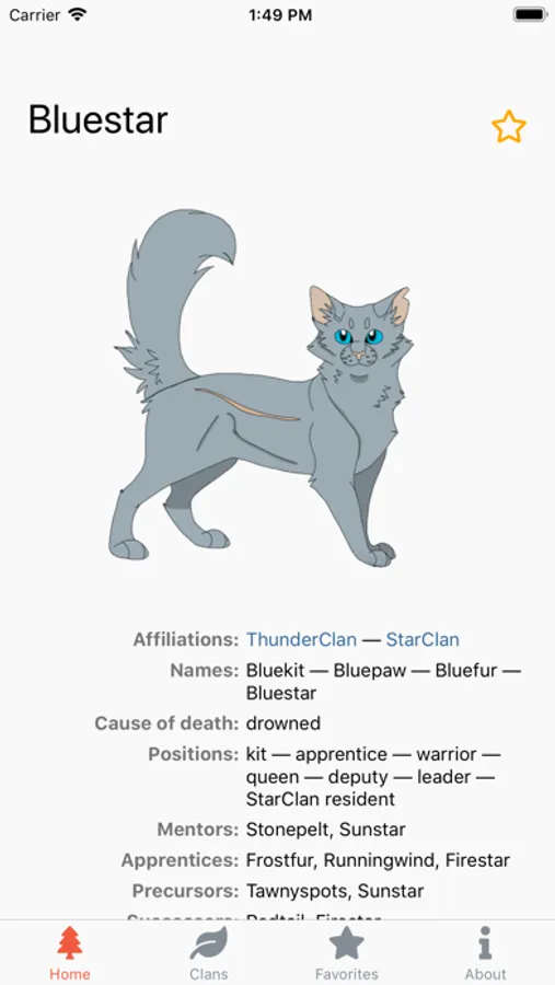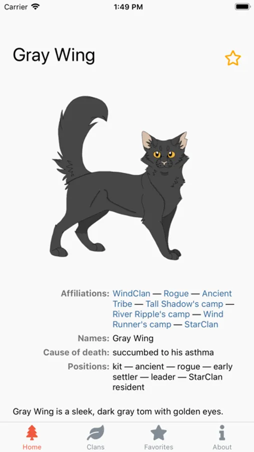 The app contains information about more than 1200 characters of Warriors by Erin Hunter: names, positions, appearance, kin and more.