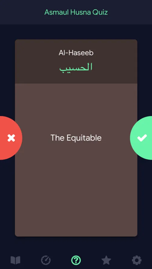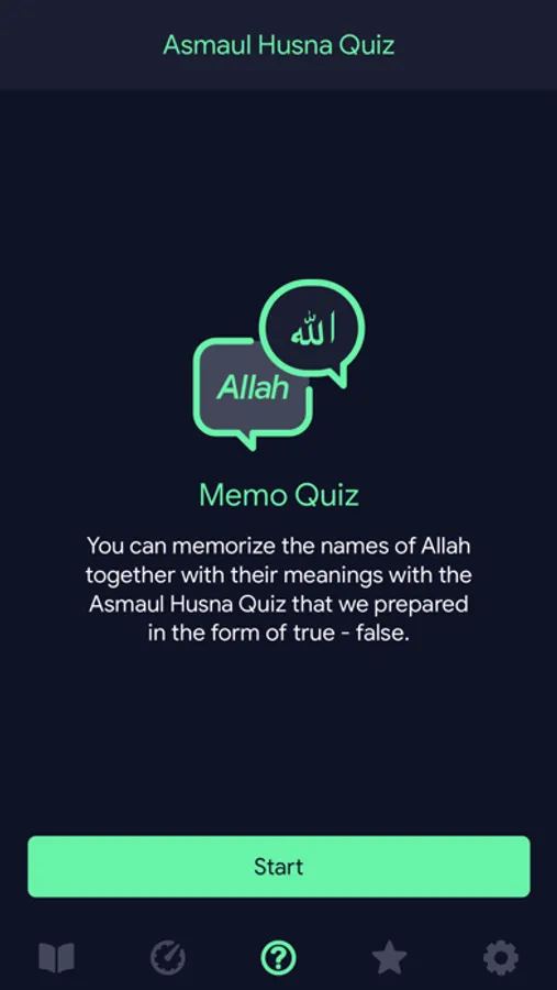 We developed the quiz in game format, 99 Names of Allah are ranked in a mixed order with the meanings of Asmaul Husna. Depending on the matching of the name and the meaning, you must answer true or false each time. Thus, you can learn the meaning and pronunciation of the 99 names of Allah and you can test your knowledge.