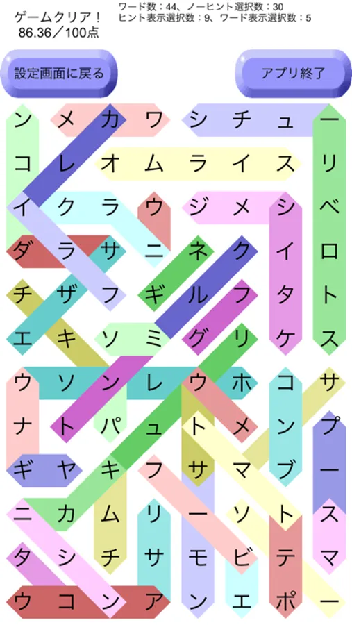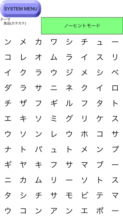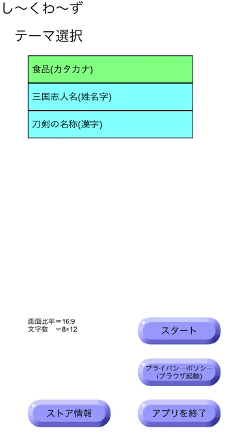 指でなぞるパズル、シークワーズ。テーマは「食品」「三国志人名」「刀剣の名称」。