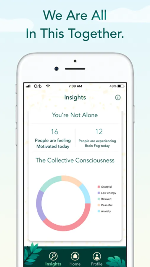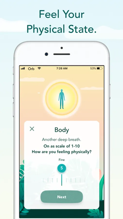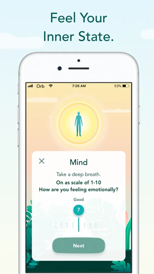 Orb’s Mind-Body Tracker offers a safe space to reconnect with yourself and discover your inner truth. Orb guides you through a simple practice called a “Check-in” where you are encouraged to take a moment to observe, acknowledge and take note of your emotional and physical feelings. In a few quick steps, Orb helps you to become more present and connected with yourself.