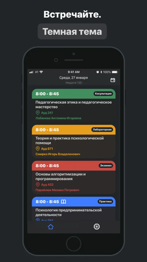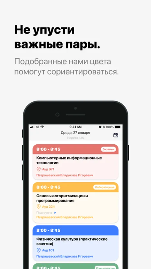 С этого дня вы сможете удобно смотреть расписание. Посмотри, там расписание на весь семестр. Приятного использования.