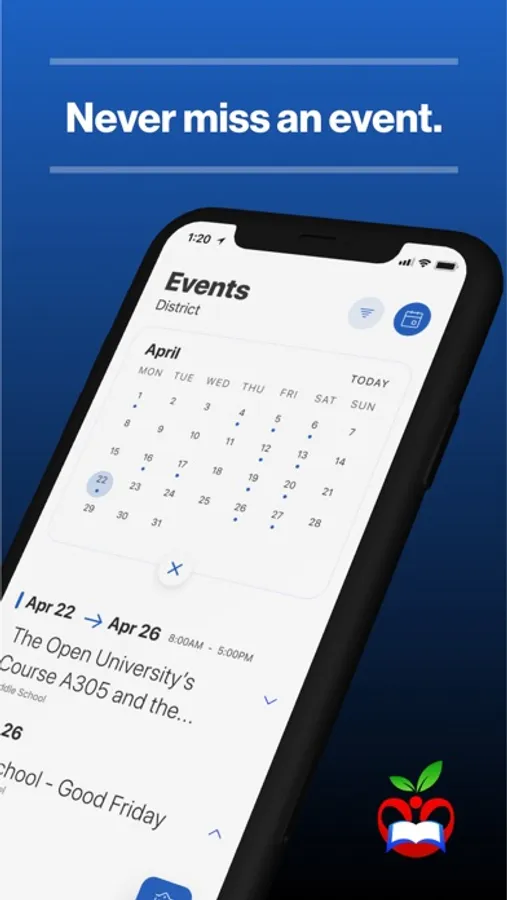 The event section shows a list of events throughout the district. Users can add an event to your calendar to share the event with friends and family with one tap.
