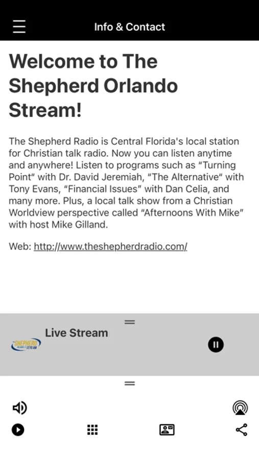 The Shepherd Radio is Central Florida's local station for Christian talk radio. Now you can listen anytime and anywhere! Listen to programs such as: Turning Point with Dr. David Jeremiah, The Alternative with Tony Evans, Financial Issues with Dan Celia, and many more. Plus, a local talk show from a Christian Worldview perspective called Afternoons With Mike with host Mike Gilland.