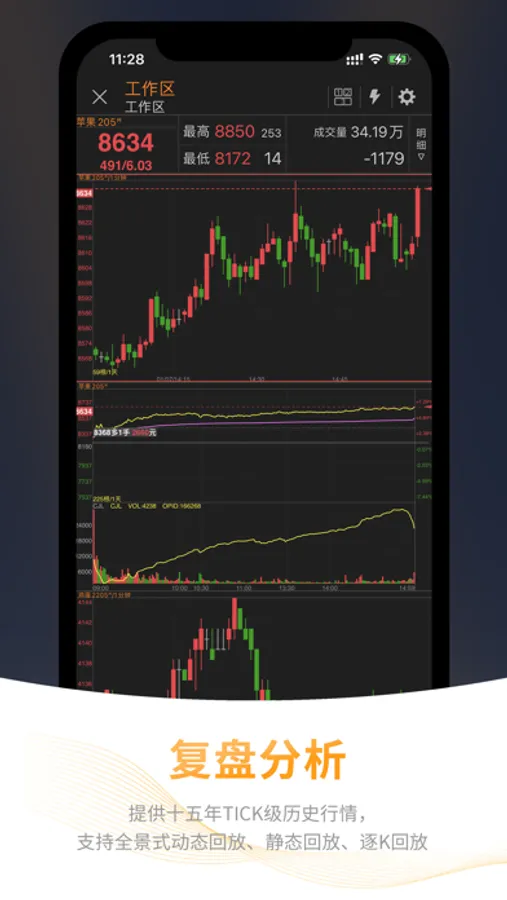 3、行情动态回放,十年TICK级历史数据,一键实现全品种多周期的动态行情回放。