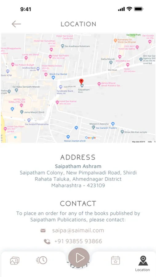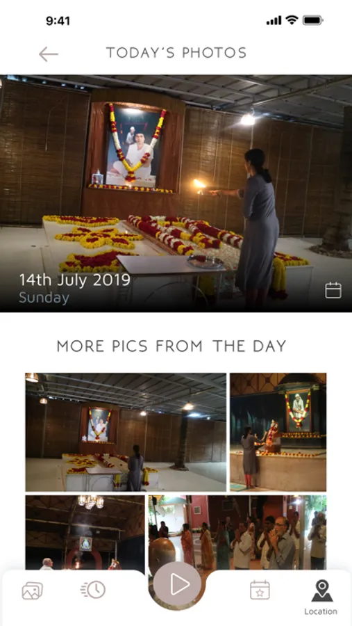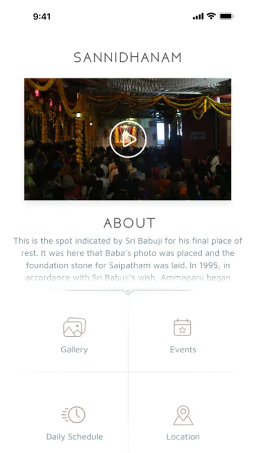 "Saipatham" app gives access to round the clock audio-video live streaming of Sri Babuji’s holy samadhi. It allows users to view the various activities at Saipatham and participate in daily Satsang which includes Naivedyam, Sai Namam, Parayana and Arati twice a day. Find information about the various festivals celebrated throughout the year, including their dates and schedules. Daily photos of Saipatham are uploaded for convenient viewing, sharing and downloading. The calendar feature in the Gallery allows users to view, share and download the photos of previous days and months. Easy access is provided to location, GPS directions, address and contact.