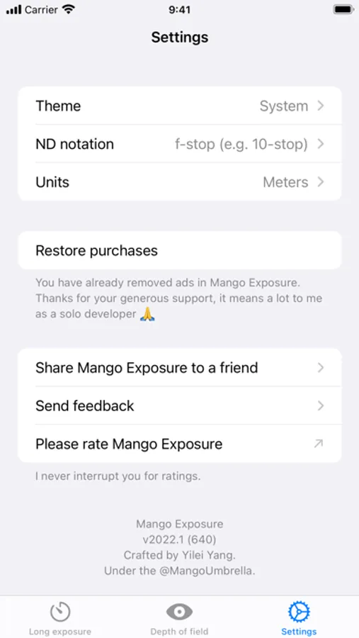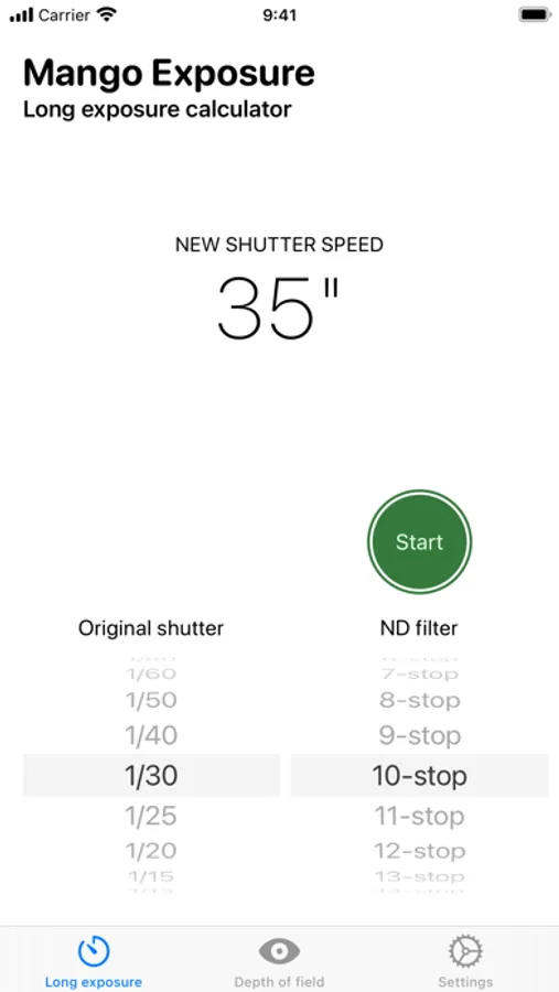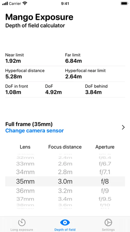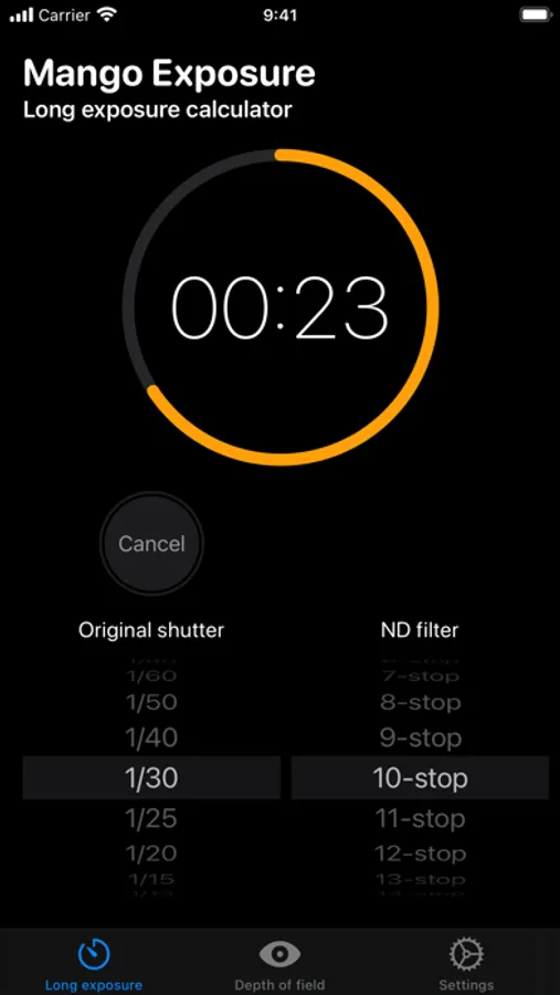 Mango Exposure is a lil and elegant app to calculate long exposure time and depth of field.