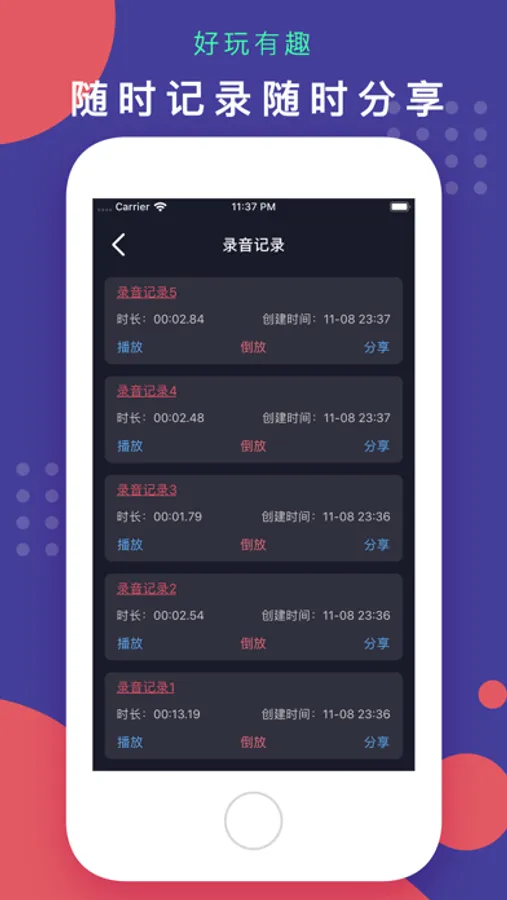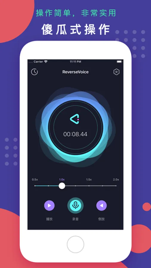 ReverseVoice - 录音倒放神器,是一款简单实用的音频小工具,它能够一键倒放您的声音,制作各种好玩有趣的声音,还支持播放速度的调整,同时会记录您的每一次录音,同样可以当做语音备忘录来使用。同时在朋友聚会中,也可以通过录制一段声音来进行各种好玩有趣的小游戏。