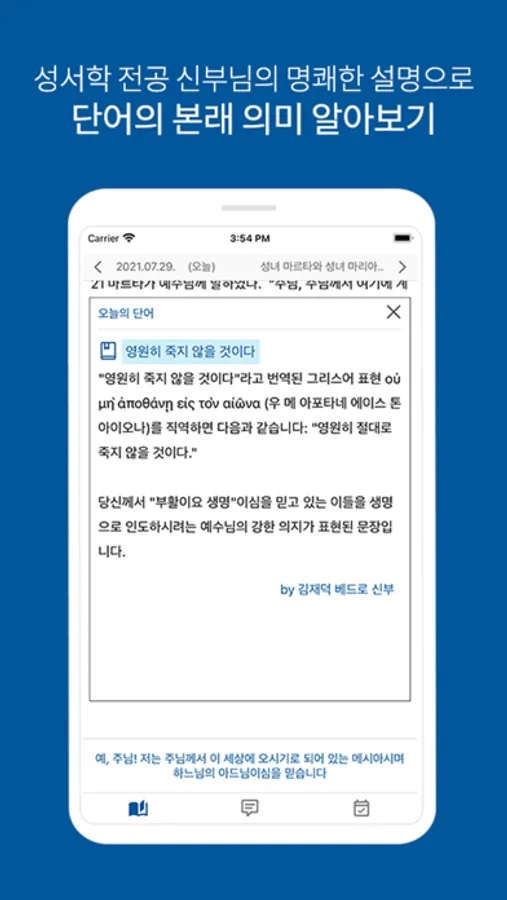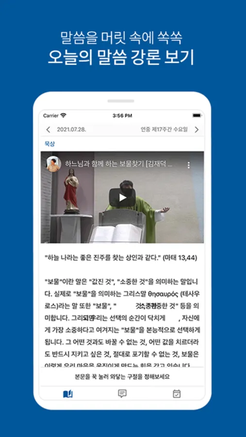 뿐만 아니라 성경본문에서 중요한 단어나 구절에 대한 해설을 볼 수 있어서 말씀을 이해하고 묵상하는데 큰 도움을 받을 수 있습니다. 또한 신부님의 강론말씀과 강론영상을 통해 말씀에 대한 깊은 묵상을 하실 수 있습니다.