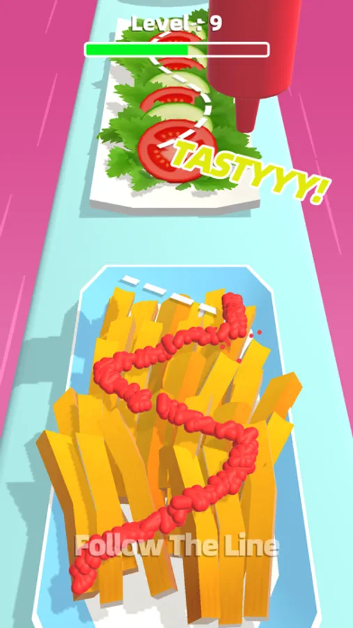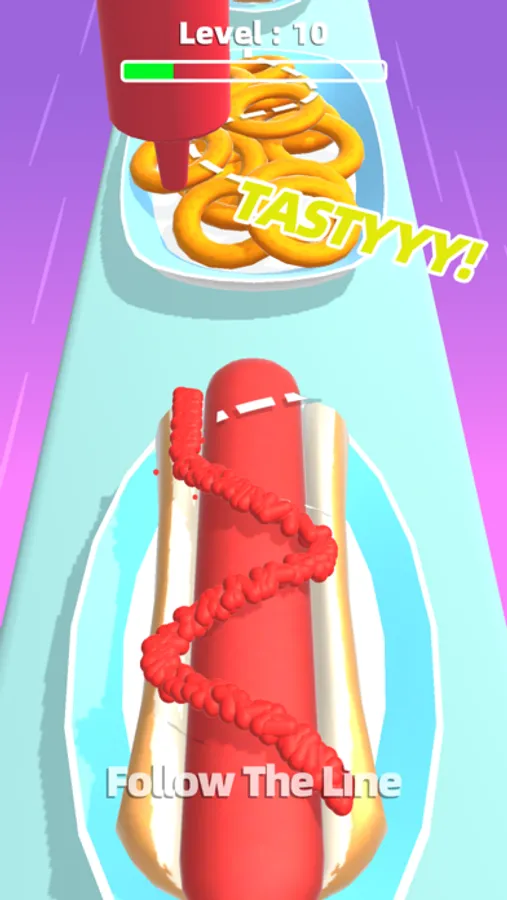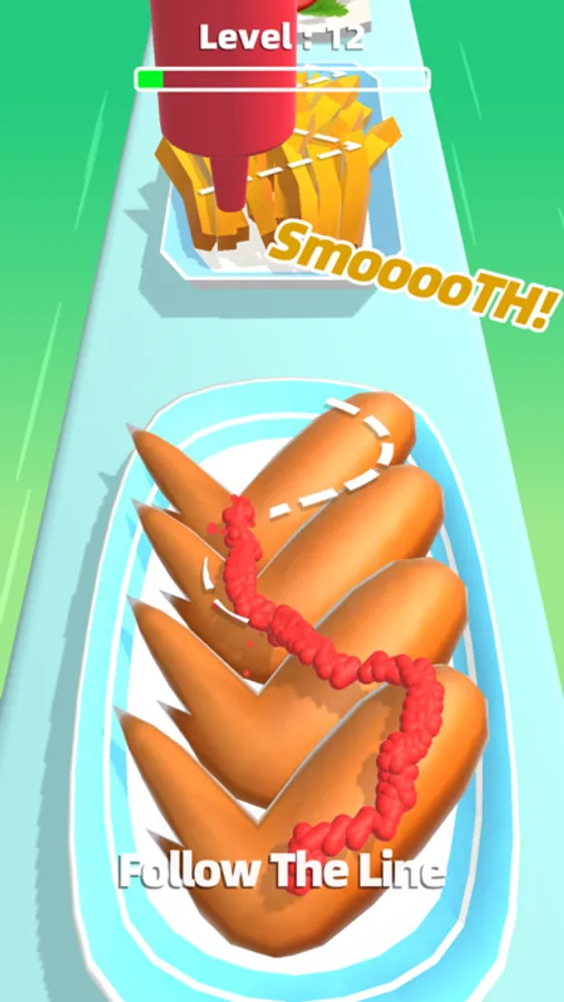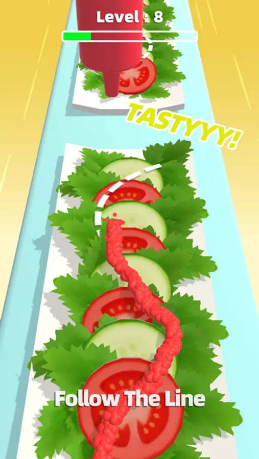 Move your finger to control the sauce bottle, follow the mapped dressing lines to put on the delicious sauce for a variety of food.