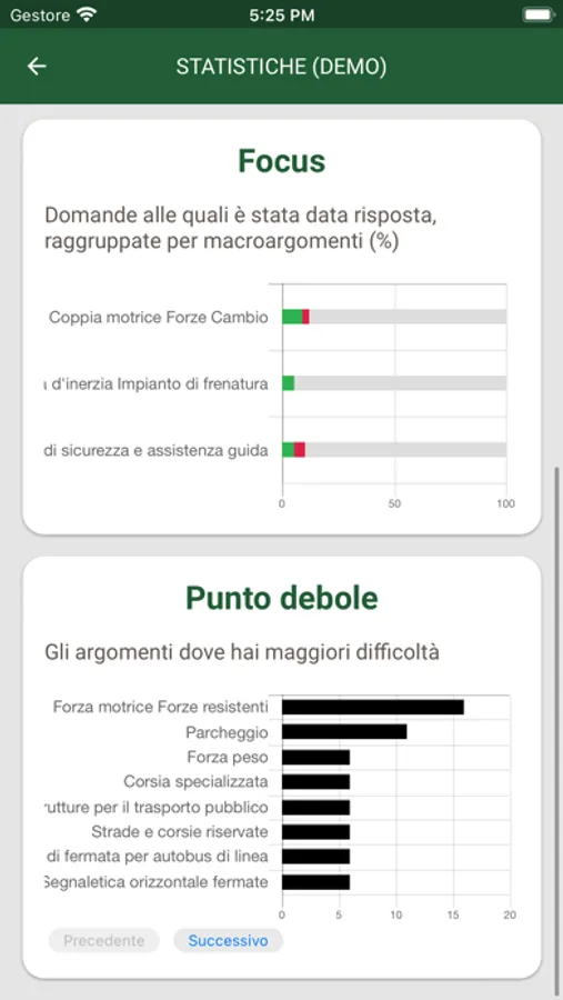 - Punto Debole: sono le domande che hai sbagliato, e che ti vengono riproposte per un ripasso degli errori