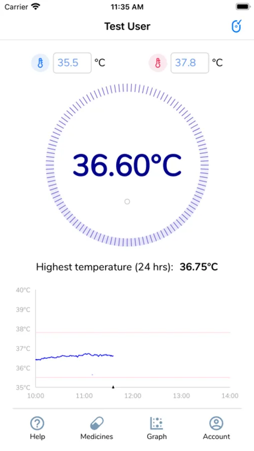 - The sensor sends a body temperature reading to the app every 4s. You can see this on the readout dial.