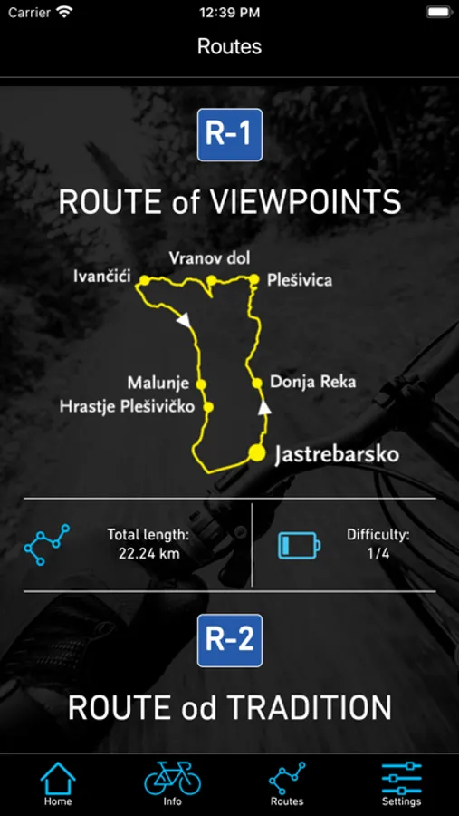 Svaka ruta ima informacije o duljini, vremenu vožnje, težini staze i ukupnom usponu. Kroz kratki