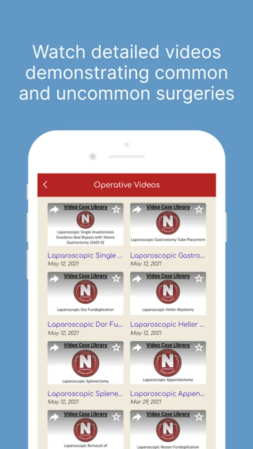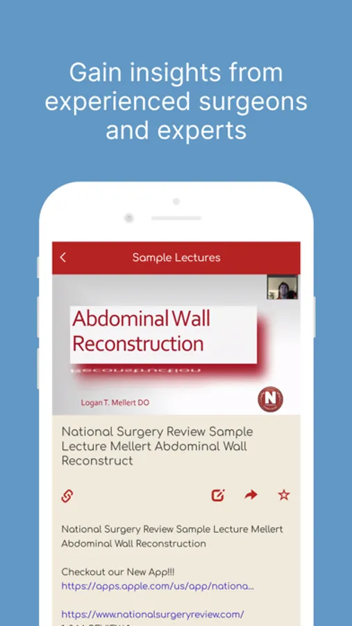 The National Surgery Review app allows surgeons to view general surgery review videos and practice questions to help prepare for the ABSITE and qualifying board exams. Other content includes our manuals to help prepare for the surgery certifying board exam, interviews with surgery experts, and videos describing common and uncommon surgeries. Surgeons can also register for our live review courses and webinars.