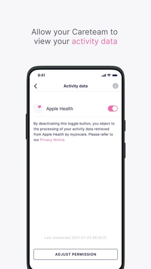 Furthermore, myoncare enables you to share selected health data through Apple Health App with your healthcare professional.