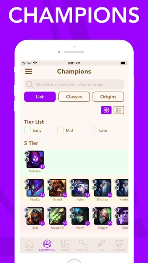 * Champions: Detailed description for champions by tier, class and origin and Tier