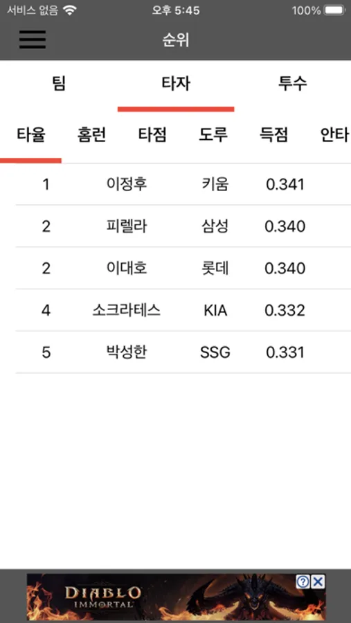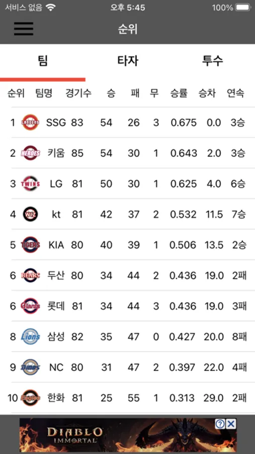 - 팀 순위를 한눈에 확인할 수 있습니다.