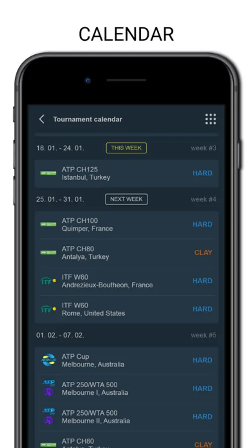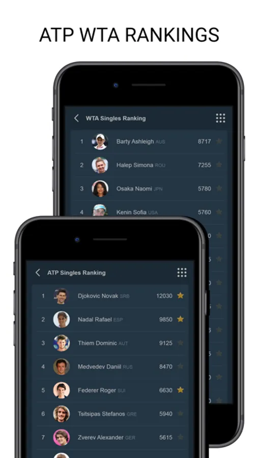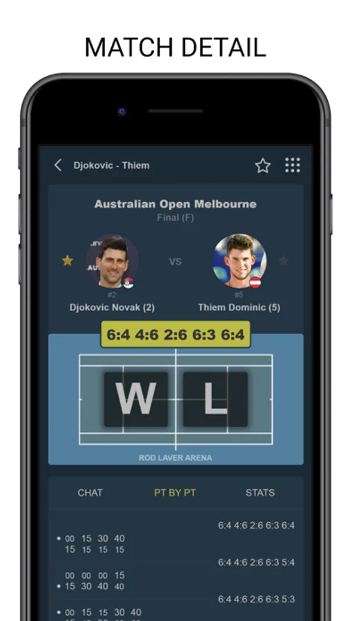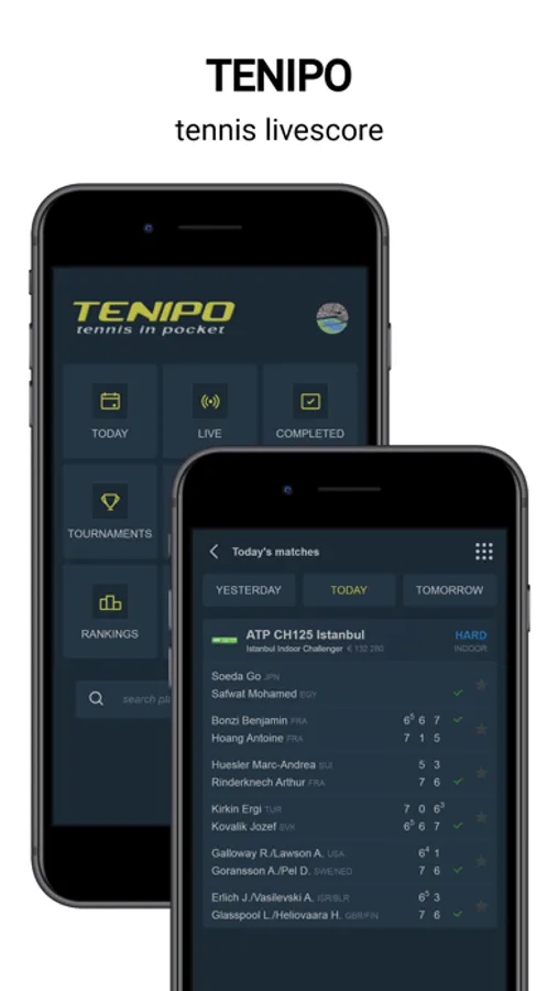 Tenipo offers live score services from a huge number of tennis tournaments all around the world. You can find here livescores from the Grand Slams (Australian Open, Roland Garros, Wimbledon and US Open) as well as from tournaments of category ATP 1000, ATP 500, ATP 250, ATP Challenger, WTA Tour and ITF events. You can check here livescore from Davis Cup and Fed Cup ties, too. Tenipo gives you a chance to follow live score services and results of the biggest tennis stars as Rafael Nadal, Roger Federer, Novak Djokovic, Serena Williams, Naomi Osaka, Angelique Kerber etc. Add them to your list of favourites and be informed of every match they play. Use the possibility and get notifications about your selected match - when it is started, when the set is over, who is the winner. Tenipo also brings you the possibility to check the statistics of the matches.