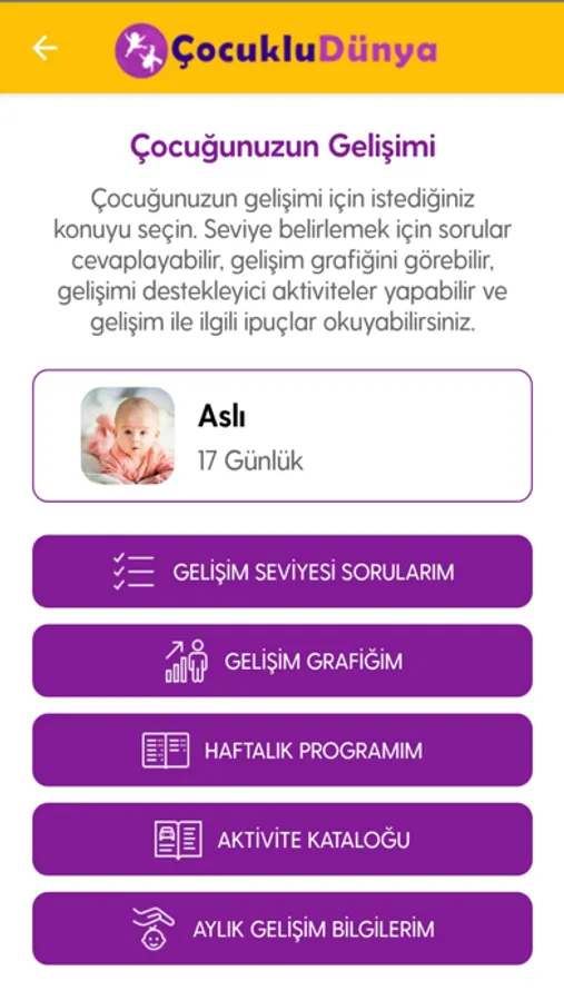 Üye olup, gelişim sorularını yanıtlayın. Çocuğunuzun gelişim seviyesini görün. Bu seviyeye uygun özel gelişim programına erişin. Hem çocuğunuzu geliştirin, hem de size annelik-babalıkla ilgili önemli ipuçları verelim.