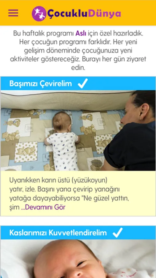 ÇocukluDünya’ya ücretsiz üye olabilirsiz. Size soracağımız sorularla çocuğunuzun gelişim seviyesini öğrenebilir ve bu seviyeye göre haftalık oyun ve aktivite programına ulaşabilirsiniz. Ayrıca, Türkiye’nin önde gelen uzmanlarının size aldığı makalelere de ulaşabilirsiniz.