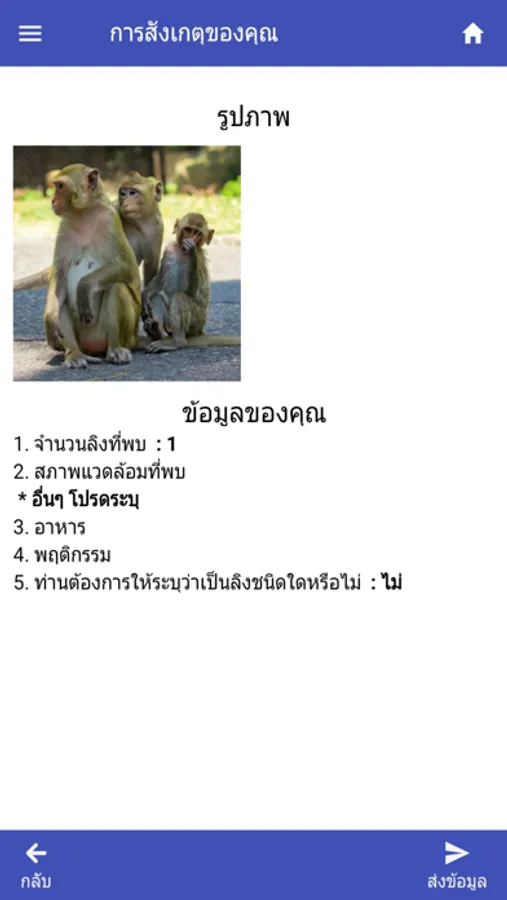 ทั้งนี้ผู้ใช้งานสามารถส่งข้อมูลลิง อาทิเช่น รูปภาพ ตำแหน่งที่พบลิง รวมทั้งพฤติกรรมของลิงที่พบเจอมายังศูนย์ข้อมูลส่วนกลางได้
