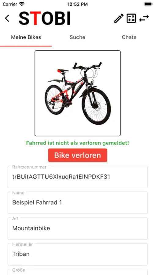 Mit der App kann man seine Bikes in einer Datenbank registrieren. Sollte ein Bike gestohlen werden, kann man den Status in der App ändern. Sollte nun ein Finder das Bike in der App mittels der Rahmennummer suchen, so wird er über den Status "Gestohlen" informiert und kann mit dem Eigentümer Kontakt aufnehmen.
