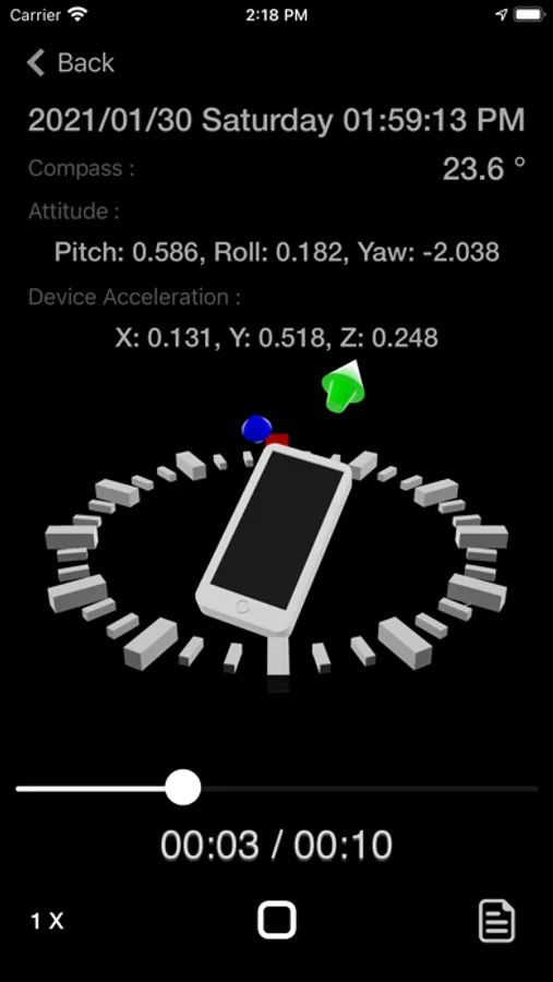 Motion Log is device sensor log tool that enables you to record the motion of your iOS Devices. The data record includes attitude, device orientation and force that apply to the device. You are able to preview the motion data after recording.