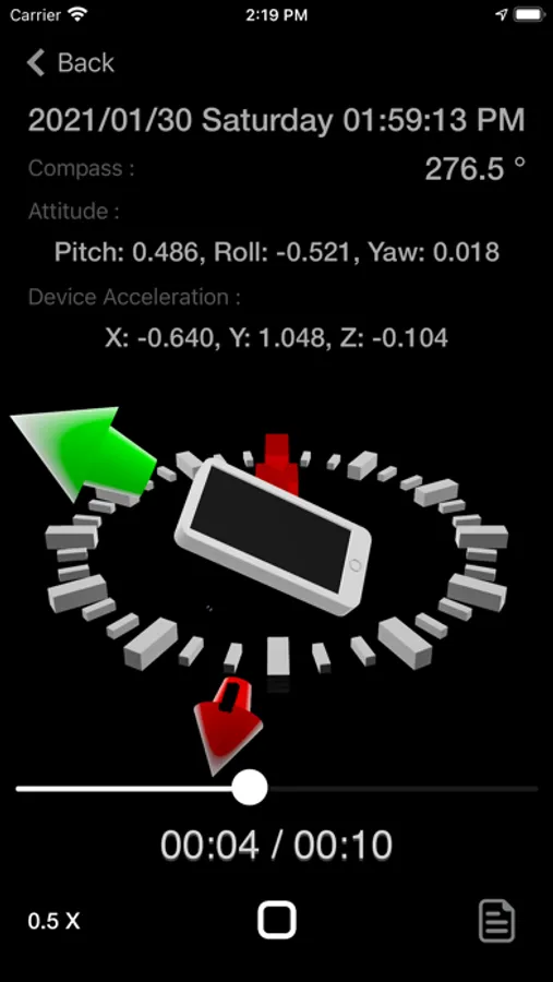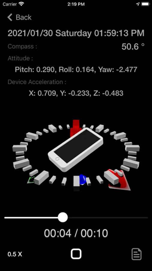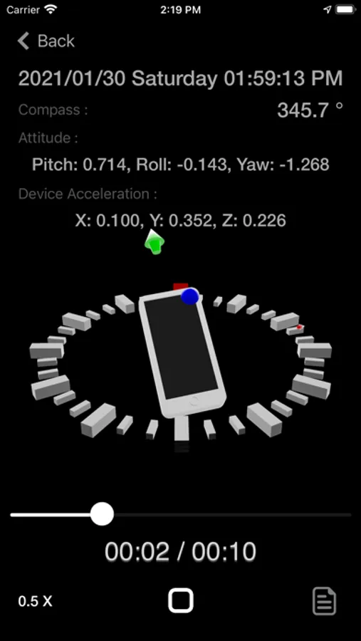 • The data array includes compass [0-360 degree], attitude [Pitch, Roll and Yaw in radian], device acceleration [X, Y, Z in [G] Gravity].