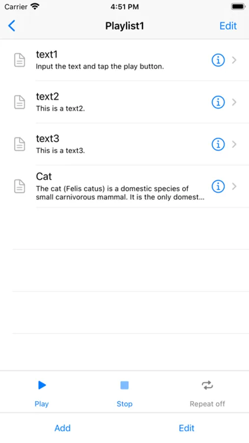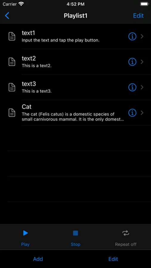 - Playlist creation. The text registered in the library can be added to the playlist and automatically played back continuously.