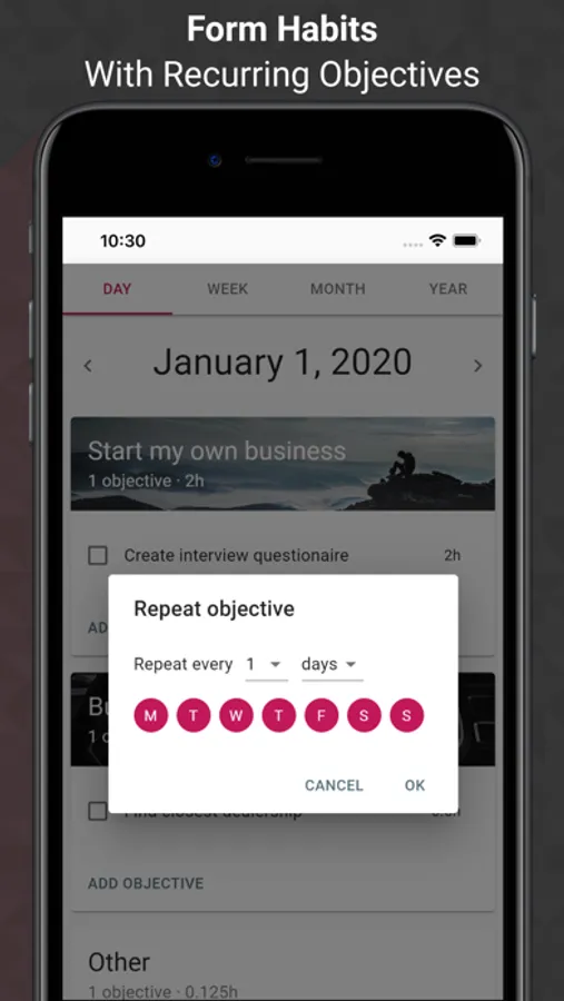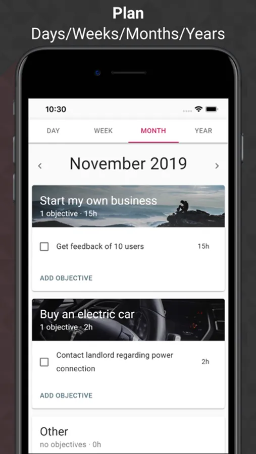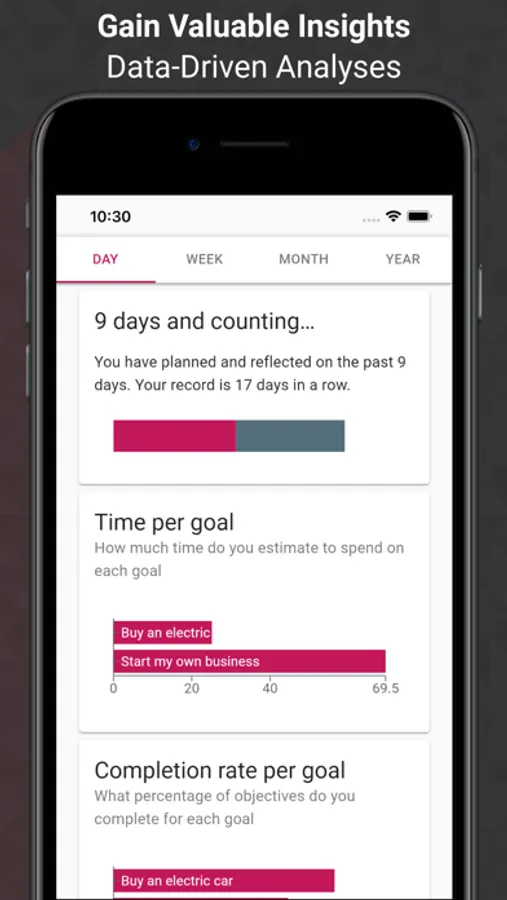 Strike a balance between your goals and responsibilities. Effortlessly create long and short term plans. Reflect on your execution, gain insights and improve you and your time management.